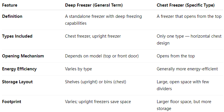 При покупке дополнительного морозистого пространства вы часто услышате термины глубоких морозильников, а морозильник, морозильник, взаимозаменяемо. Хотя они оба служат цели сохранения замороженных продуктов в течение более длительных периодов, между ними существуют тонкие, но важные различия. Давайте рассмотрим, что отличает их и как выбрать правильный для ваших нужд.